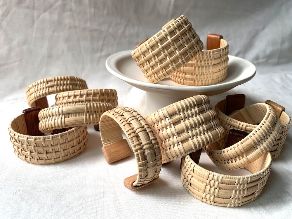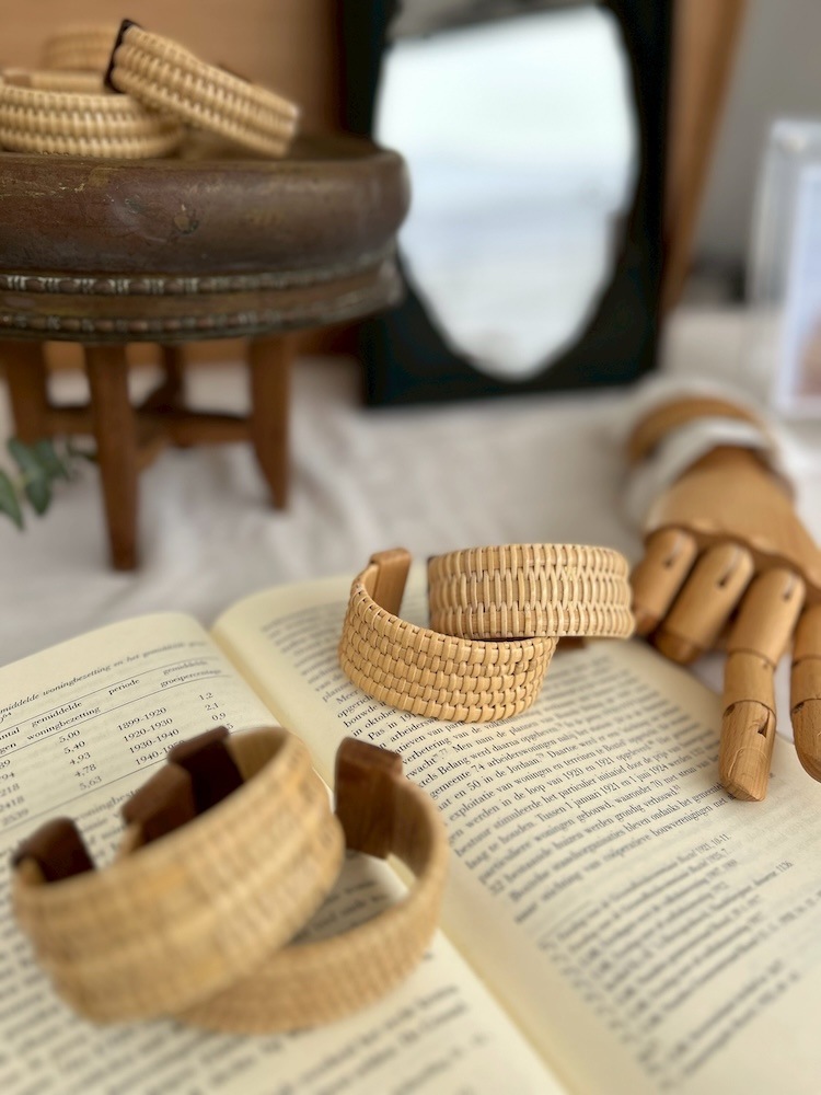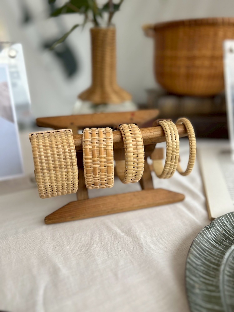 天然素材の籐(ラタン)とオリジナルのウッドパーツ、真鍮を組み合わせた唯一無二のナンタケットバングルやヘアアクセサリーを取り揃えています。
