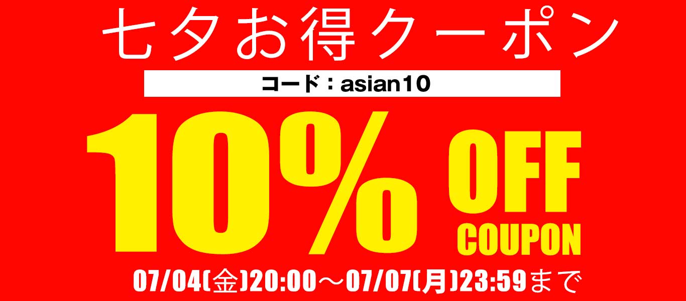 店内全品対象の10%OFFクーポンを発行しております。クーポンコード「asian10」をご注文時にコピー&ペーストして下さい。 |