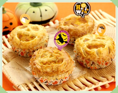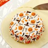 型に冷凍パイシートをひき、かぼちゃクリームを入れ、顔型にくり抜いたパイ生地でフタをし、表面によく溶いた卵をハケでぬる。
