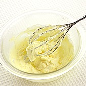 バターと砂糖を泡立て器で、白っぽくなるまでよく混ぜる。