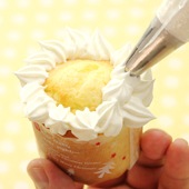 土台のマフィンが焼きあがったら、十分冷まします。アニマルマフィンは、 表面に(2)の生クリームを塗ります。お好みのお菓子をトッピングして、動物を作ろう!
