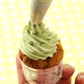 クリスマスマフィンB)残りの生クリームに抹茶を混ぜ、グリーンのクリームを作る。マフィンの上にソフトクリームのように、円を描くように絞り、アラザンをトッピングする。クリスマスの飾りつけもおすすめ。