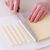 (3)の生地を麺棒で5mmほどの厚さに延ばして、5mm幅に切る。