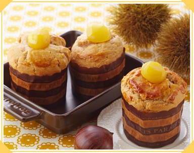 *マロンマフィン* ~今月のマフィン~ 10月のマフィンは、ホットケーキミックスとマロンペーストを混ぜた、お手軽なのに本格的なお味のマロンマフィン。ペーストを混ぜることで生地にも優しいマロンの風味が。さらに角切りに栗を混ぜることで、栗の味わいと食感が楽しめます。 ![]() 材料 5個分