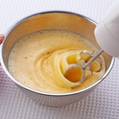 ボウルにバターと砂糖を入れ、白っぽくなるまでよく混ぜ、塩を加えて、クリーム状になるまで混ぜる。溶いた卵と牛乳を少しずつ加え、その都度、よく混ぜる。