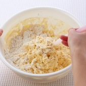 (1)の生地を少量、ボウルに取り、振った粉を少しだけ混ぜて、元のボウルに戻す。残りの粉類とドライフルーツを入れ、さっくりと全体を混ぜ合わせる。