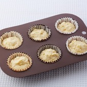 カップケーキの型に紙型をはめて生地を8分目まで入れ、180℃のオーブンで淡いきつね色になるまで約20分焼く。竹串をさして生地がつかなければ焼きあがり。