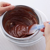 チョコガナッシュを作る。ボウルに細かく刻んだ板チョコを入れて80℃くらいの湯煎にかけ、ゴムべらでよく混ぜて溶かす。 ![]() ![]()