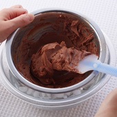 (1)が完全にとけたらに生クリームを少しずつ加えて、よく混ぜます。さらにボウルの底に氷水を当て、しっかりと練り混ぜます。 ![]()