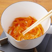 水にさらしておいた皮は、ぺティナイフなどで皮の裏側の白い部分をそぎ落とす。鍋に入れ、ひたる程度の水を加えて火にかけ、沸騰したら、ザルで湯切りする。これをもう一度繰り返す。 ![]()
