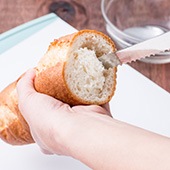好みの厚さにカットする。 フルーツとクリームチーズのスタッフドバケット