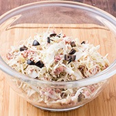 ボウルに千切りキャベツを入れ、軽く塩もみして、よく絞る。玉ネギのスライス、コンビーフ、角切りしたブラックオリーブを白ワインビネガー、粒マスタード、マヨネーズを加えて、よく混ぜる。