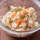 (1)の粗熱が取れたら、鮭フレーク、スライスした玉ネギ、マヨネーズ、酢、塩・こしょう、刻んだディルを加え、よく混ぜる。