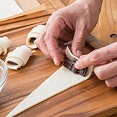 三角形の底辺側に割ったチョコレートを置き、くるくるとパイシートを巻きつける。 ![]()
