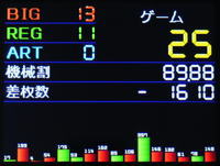 はまりグラフはボーナスごとに色分け(BIG=赤、REG=緑、ART=水色)され非常に見やすいです。 |