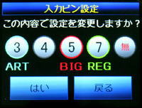 BIG、REG、ARTの信号を入力ピンに割り当てます。 BIG⇒REG⇒ARTという順にタッチ操作を促す表示になりますので、対応するピン(3番、4番、5番、7番)を選択します。 ※通常、4号機以降の機種は、この「3番、4番、5番、7番」の何れかのピンにボーナスやART信号を割り当てられています。機種やメーカーにより多様な組み合わせがあり、この画面にて機種ごとに割り当が可能です。 BIGとREGまたは、BIGとARTしか出力されないといった機種があります。その場合、出力されない信号は「無」を選択して下さい。 出力の無い機種に割り当てするとボーナスやARTが正しくカウントされません。 |