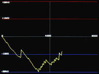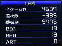 当日のスランプグラフを表示します。縦軸が差枚数(実質無限)、横軸が全ゲーム数(軸の表示領域は差枚数やゲーム数により擬似的に拡大していきます)。 横軸(全ゲーム数)は8000ゲームまでとなります。それ以上は拡大しませんがゲームの続行は可能です。 スランプグラフをクリアする場合は、当日データを移行させるか全データを消去して下さい。 |