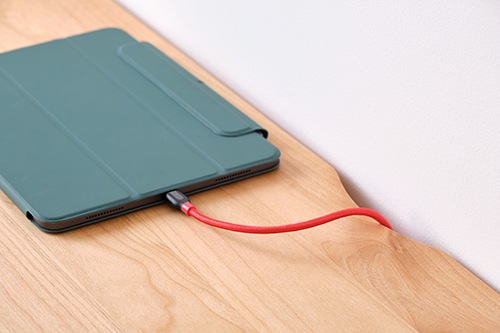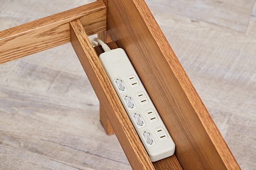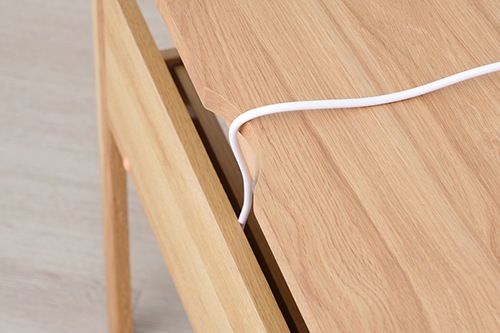 天板に設けた欠き込みで、ごちゃごちゃしやすいコード類をすっきりと。