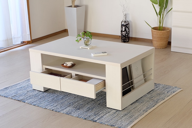 リモコンや雑誌、リビングで散らかりがちなものをスッキリと収納できるテーブルは、快適な空間づくりに欠かせません。 ごちゃごちゃしがちなものを隠すことで、視覚的なストレスも軽減されます。