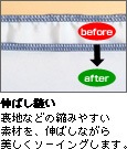 | 縁かがりと同時に市販のゴムテープを縫い込むことができます。水着やショーツ作りに便利です。 |