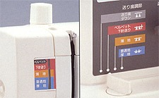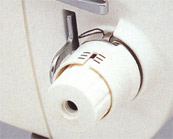 布押え圧力調節つまみと、ドロップフィ−ドつまみとのカラーを合わせるだけで薄地から厚地、ベルベットまで、どんな素材にも適した布送りに調節できます。送り歯上下調節が”ベルベット・下針送り”の位置にあるときに布送り針が作動します。