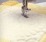 ドロップフィードつまみで送り歯が下がるのでキルティングなどの曲線ぬいも自由自在。連続した曲線模様も美しい仕上がり。