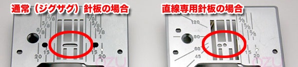 | 【通常針板(ジグザグ針板))針落ち穴の形状】 | 【直線縫い専用針板針落ち穴の形状】 | |