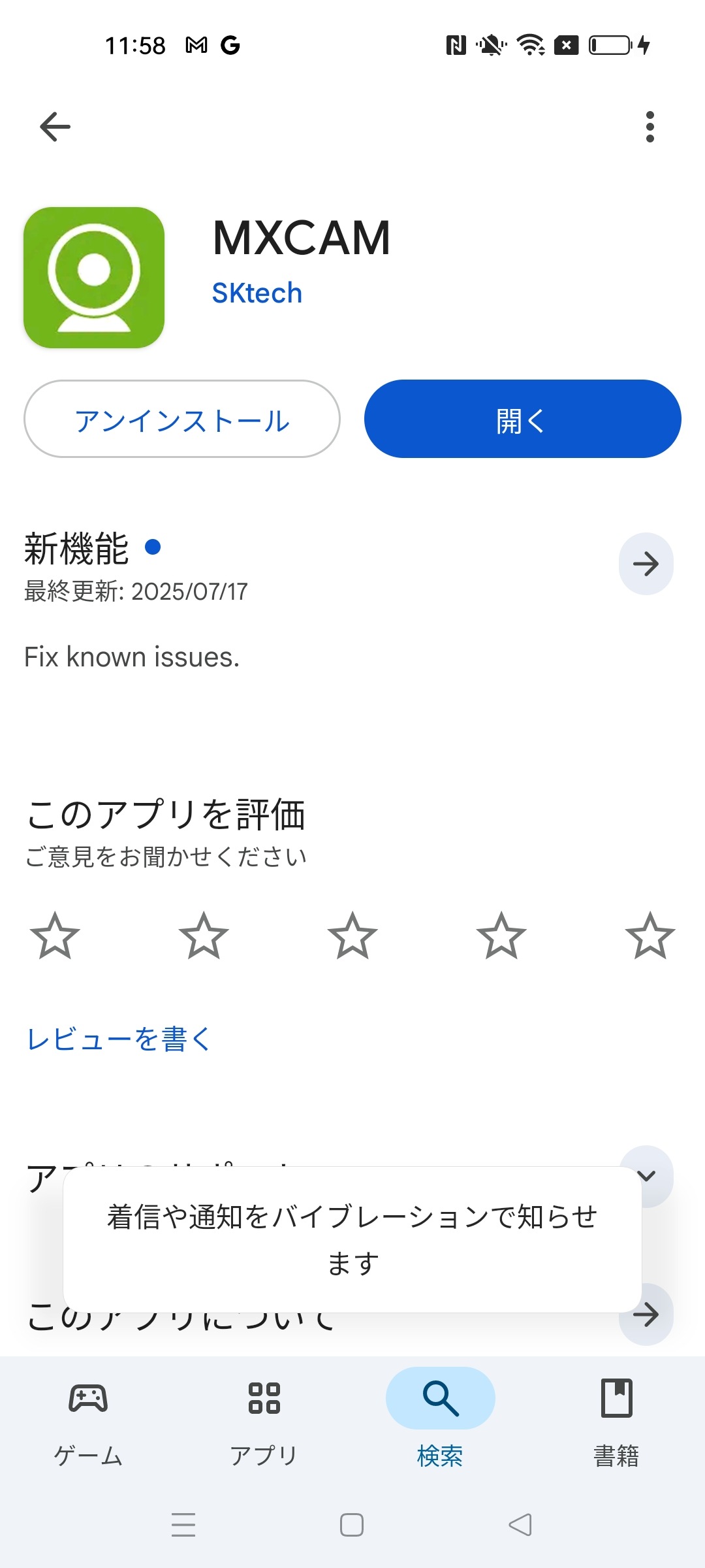 上記のように日本では使用できない旨のメッセージが出ます。 一方、GooglePlayで'MXCAM'を検索かけると