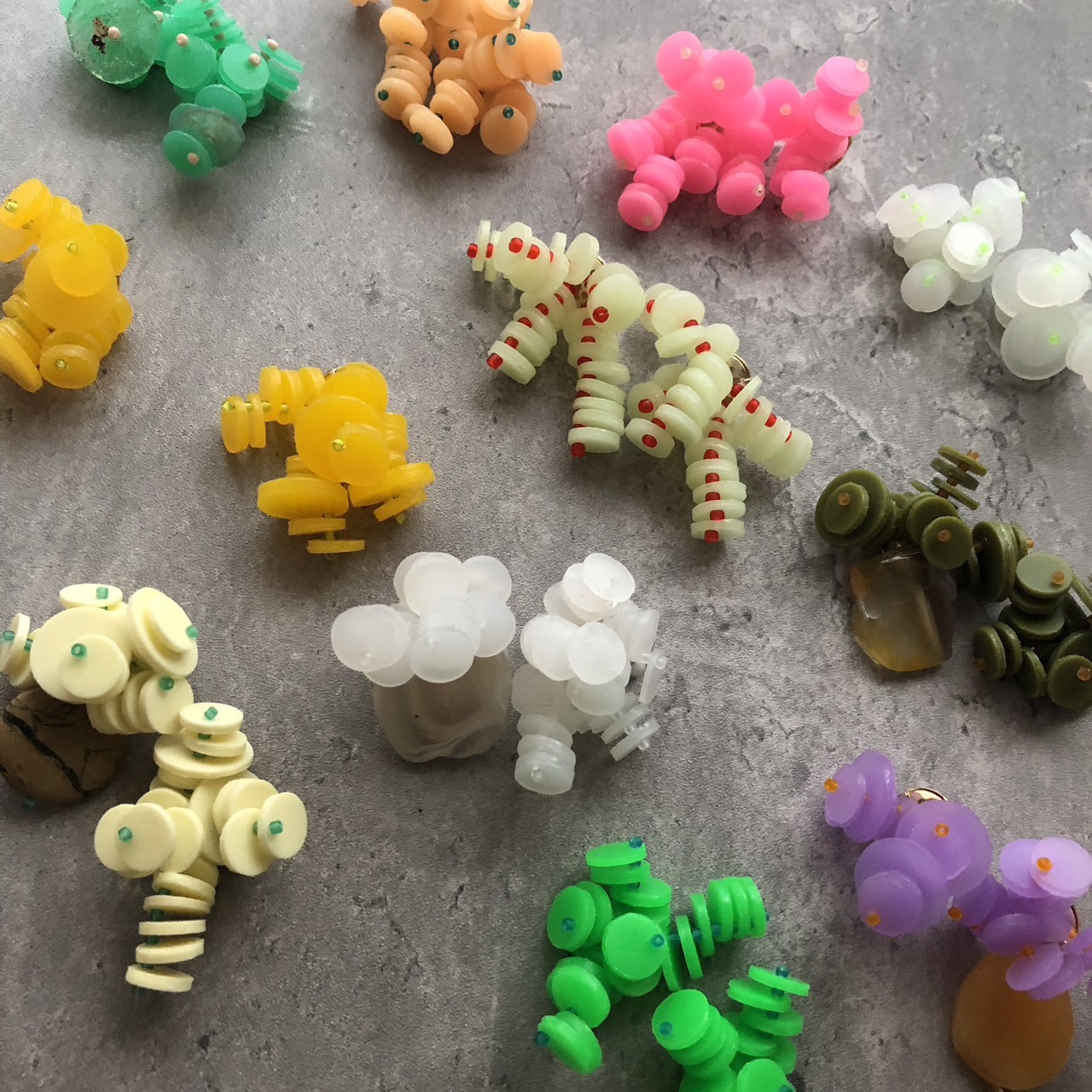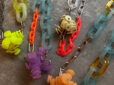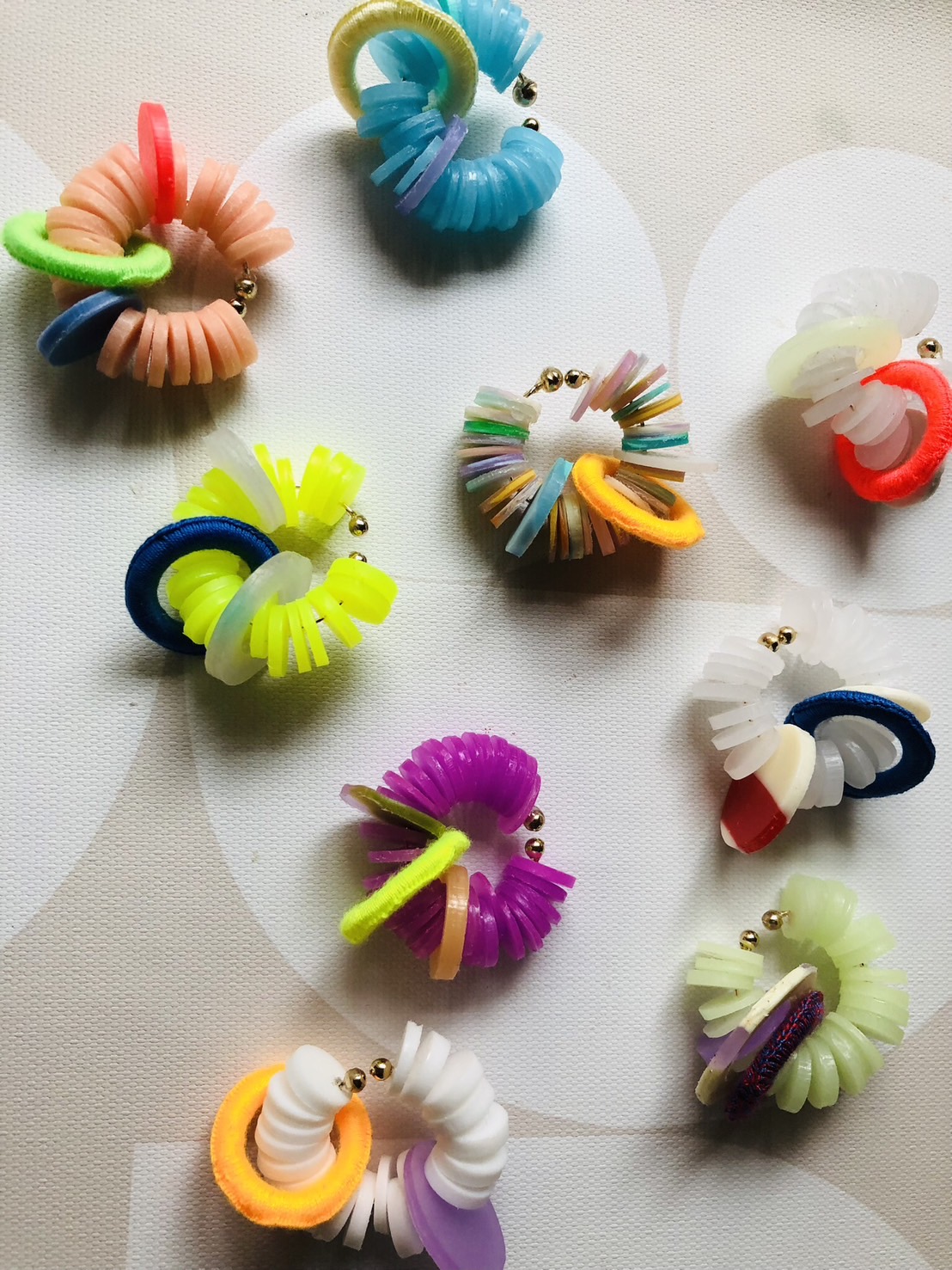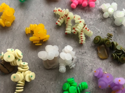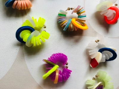 プラスチックを中心に異素材をミックスさせ、縫ったり編んだり遊び心満タンでアクセサリーを製作しています。
