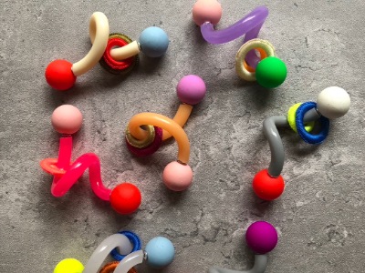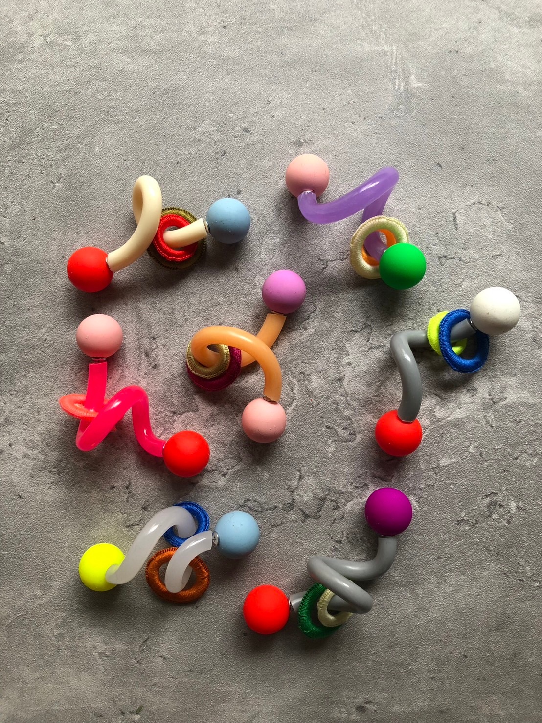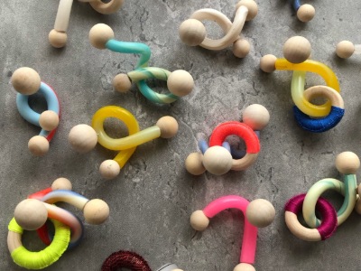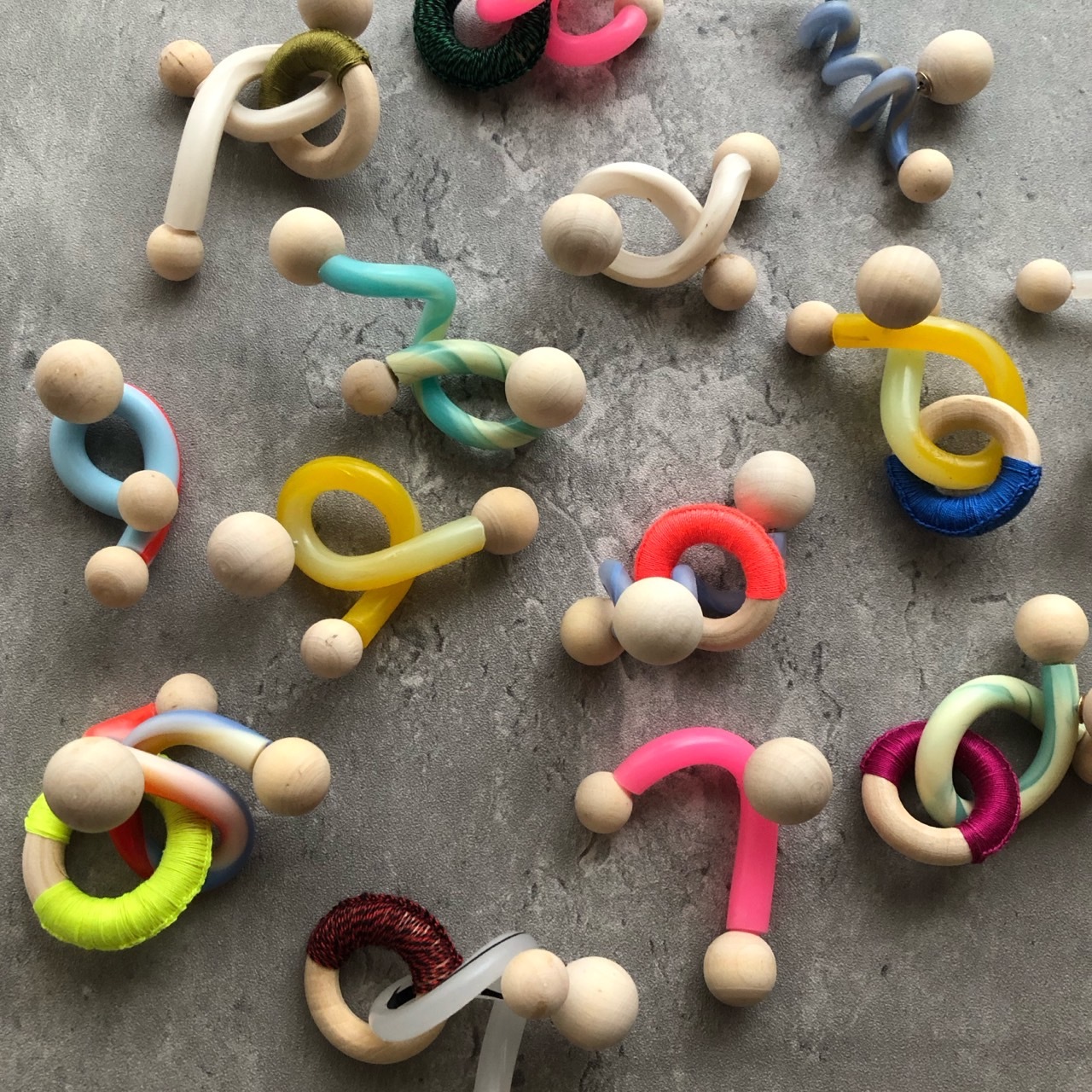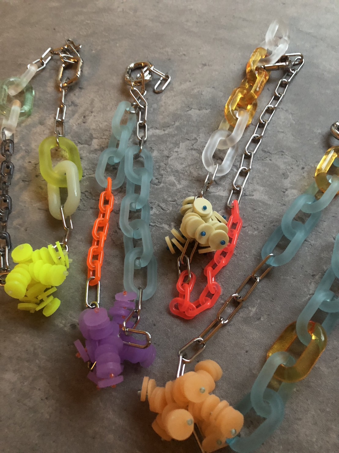 プラスチックを中心に異素材をミックスさせ、縫ったり編んだり遊び心満タンでアクセサリーを製作しています。