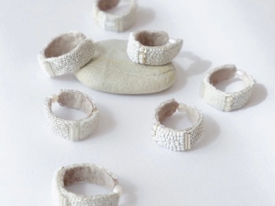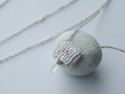 ひと針ひと針刺繍装身具を制作。