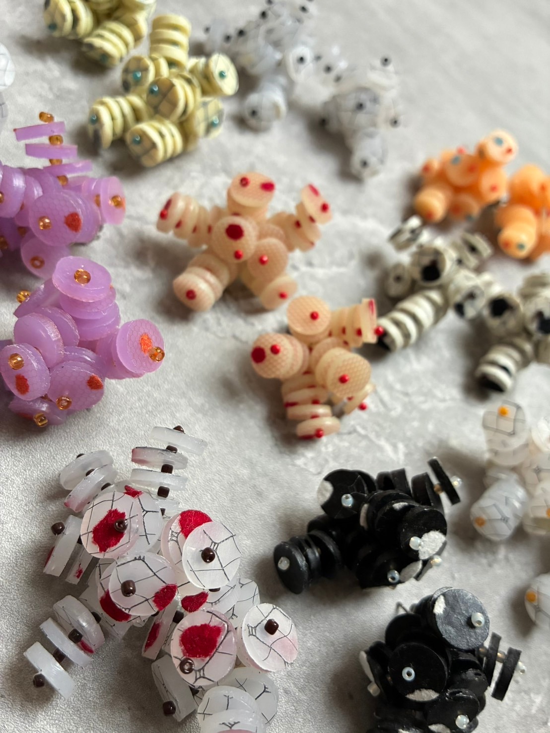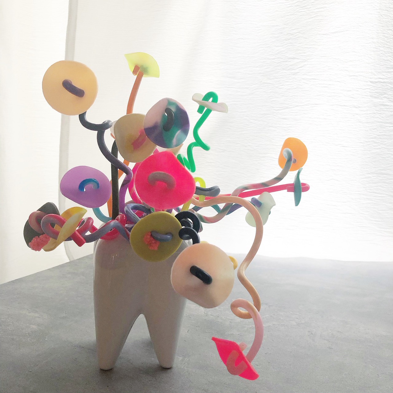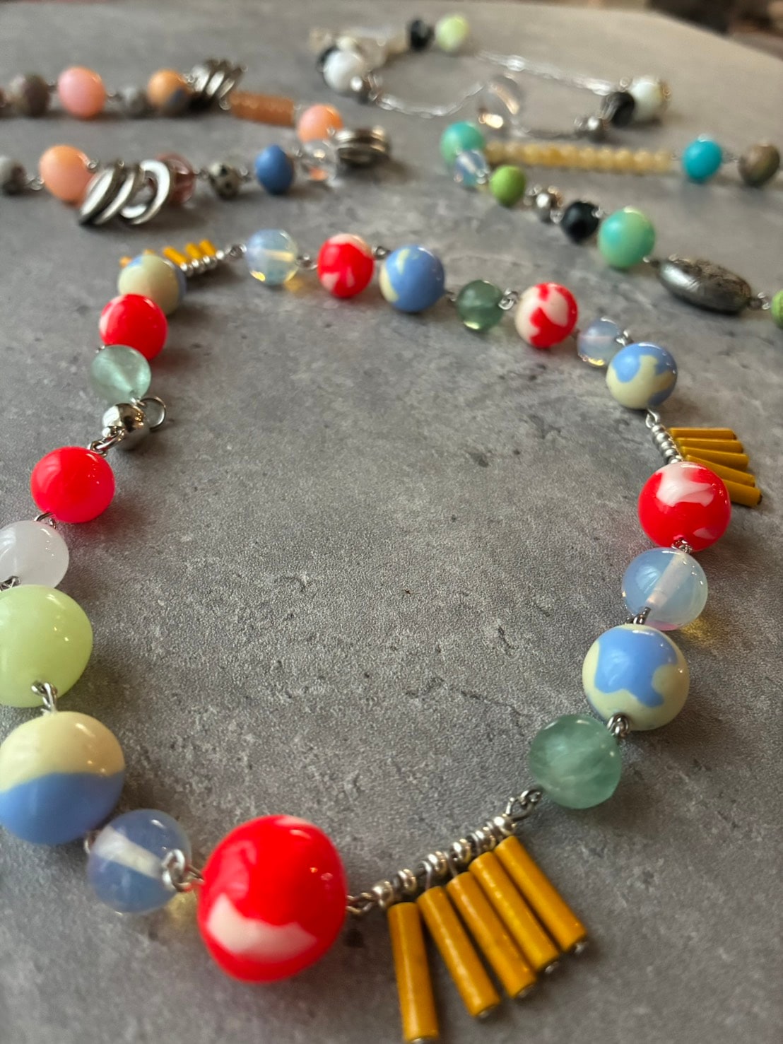 プラスチックを中心に異素材をミックスさせ、縫ったり編んだり遊び心満タンでアクセサリーを製作しています。