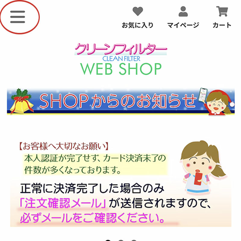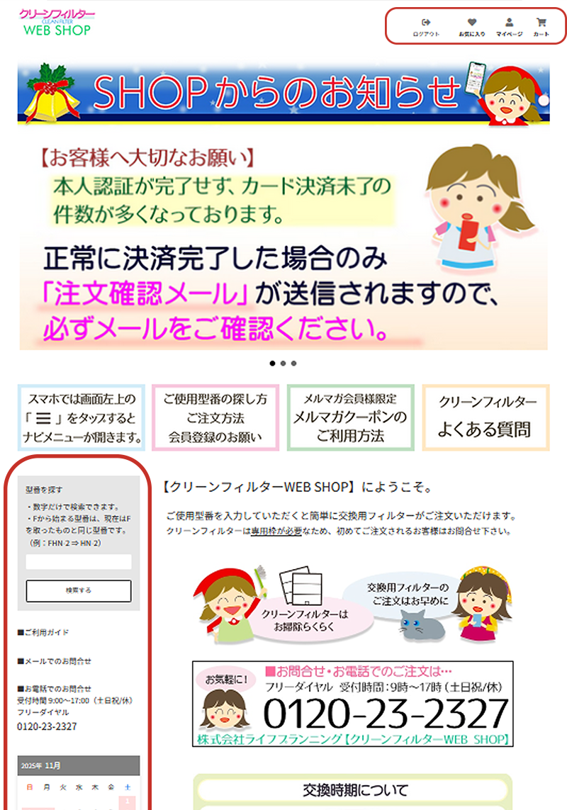 上部ヘッダーに「ログイン」「マイページ」「カート」などのボタン、大きな画像の左下の方に型番検索などのメニューが表示されています。