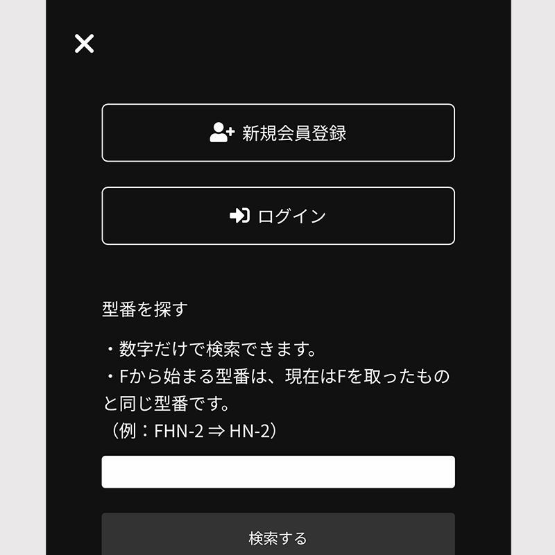 ナビメニューでは、「ログイン」「新規会員登録」「型番を検索」などができます。