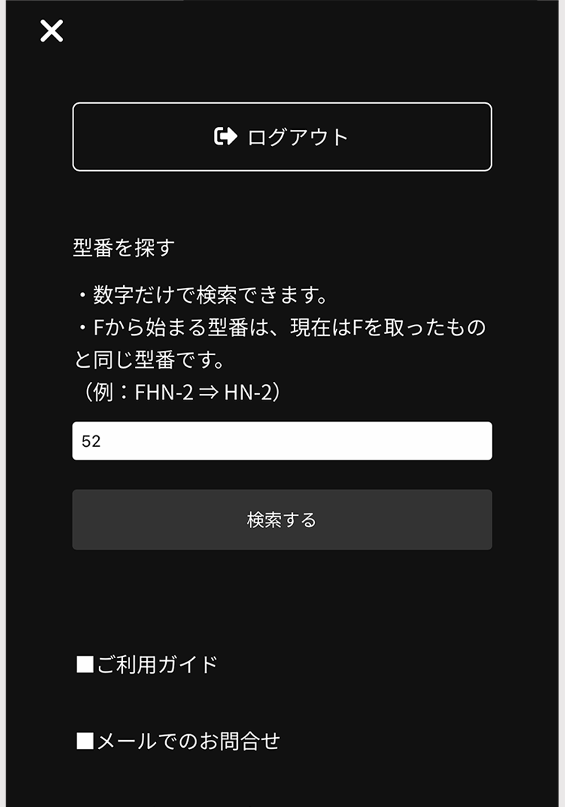 ナビメニュー( 「1.ナビメニューの出し方」参照)を開いて、「型番を探す」の空欄に型番の一部の数字を入力してください。数字だけで検索できます。