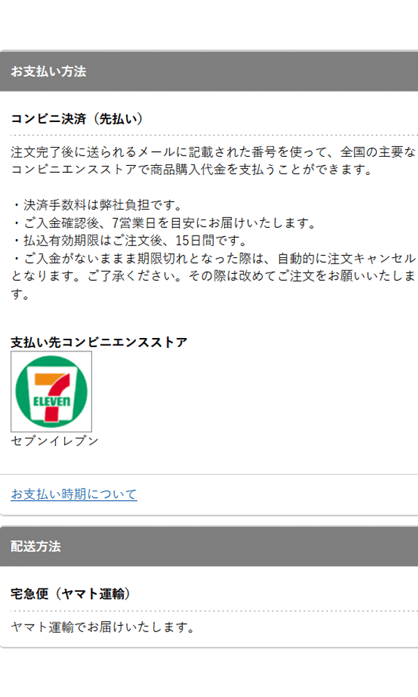 ここではセブンイレブンを例にとります。 - 弊社が入金を確認してからの配送手配となりますので、ご希望の日にちがある場合は、間に合うようにお早めのご入金をお願いいたします。