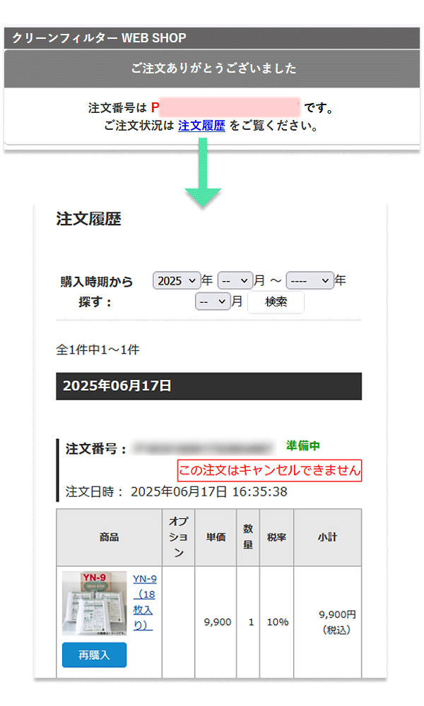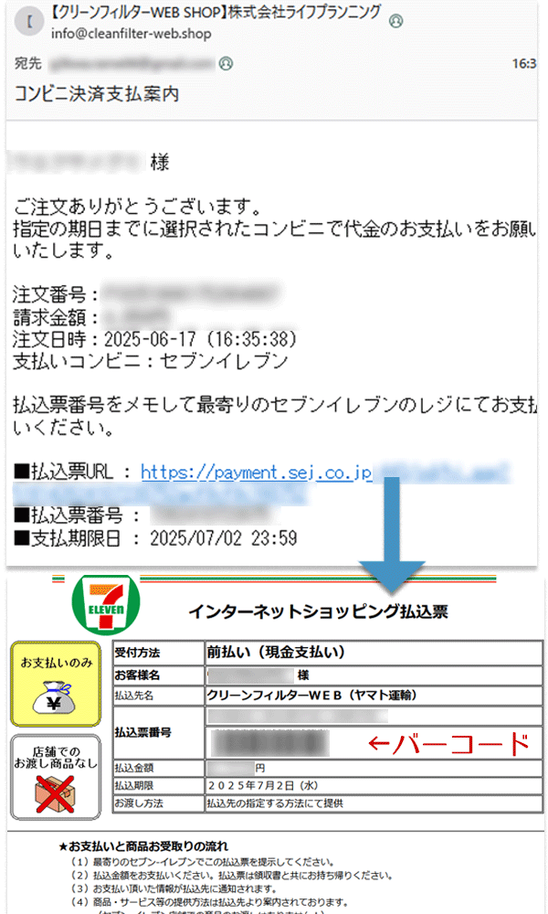 「コンビニ決済支払案内」というメールが別に配信されます。 - 「コンビニ決済支払案内」メールは、クロネコwebコレクトで番号が発行されてクリーンフィルターWEB SHOP経由で送信されるため、別のメールフォルダに入る場合がございます。迷惑メールフォルダなどを必ずご確認ください。