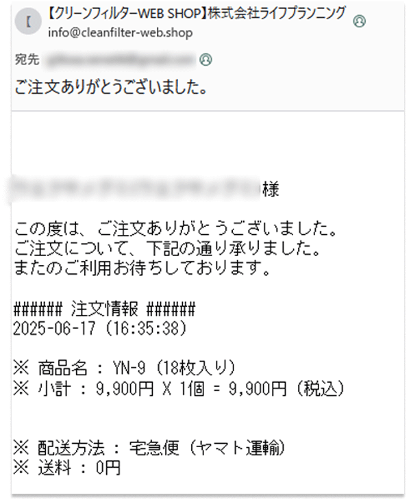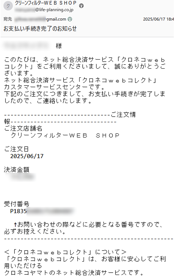 送信者アドレス(○○@life-planning.co.jp)はクロネコwebコレクト担当の弊社のものです。ご安心ください。