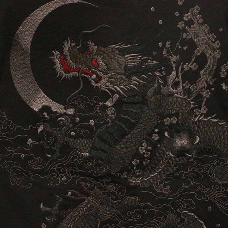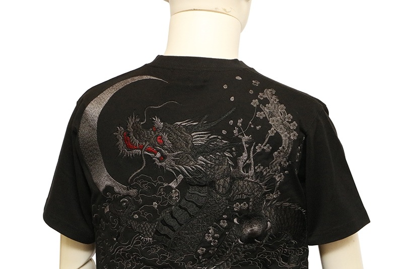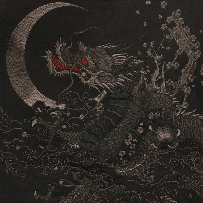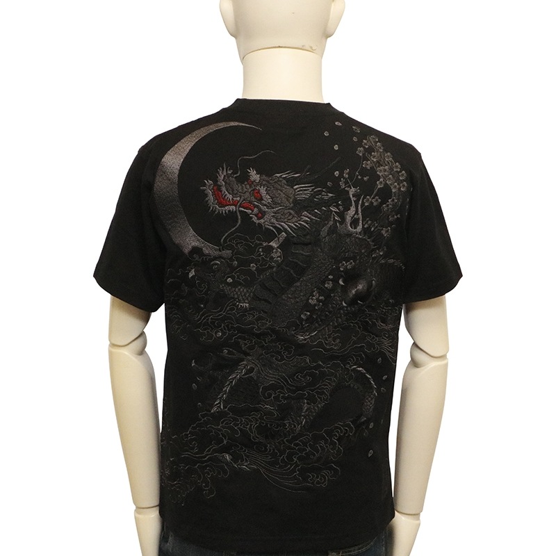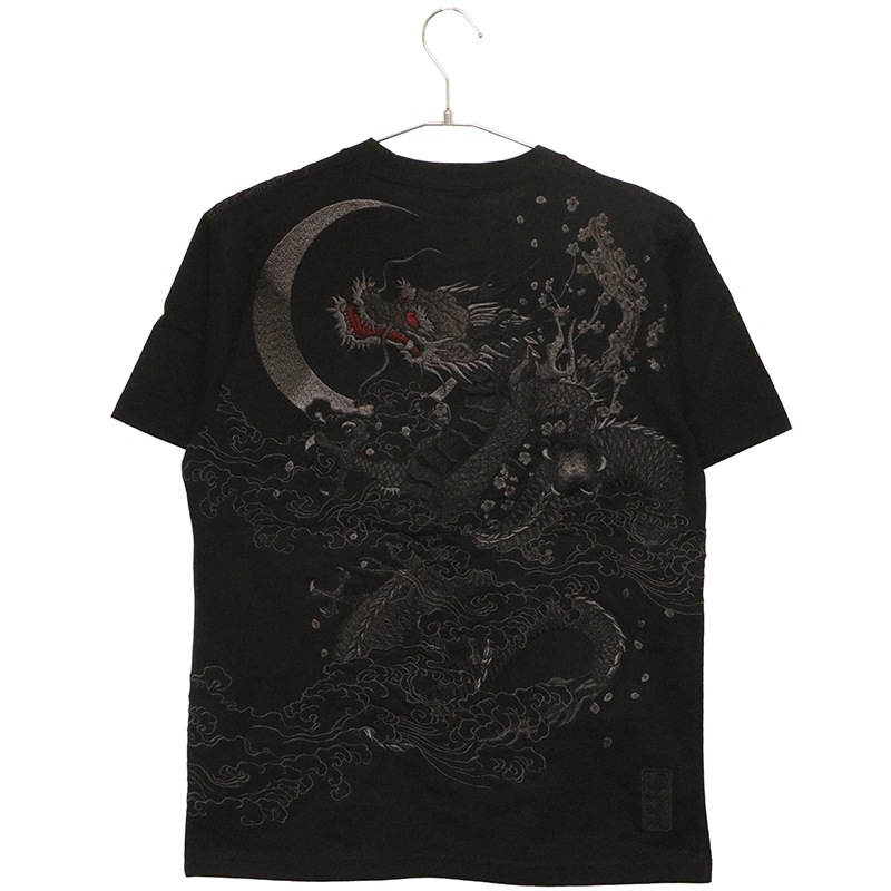 三日月を背景に天に登る龍を迫力ある構図で背面に刺繍で落とし込んだ半袖Tシャツ。