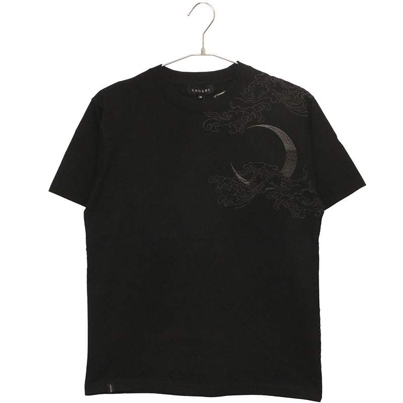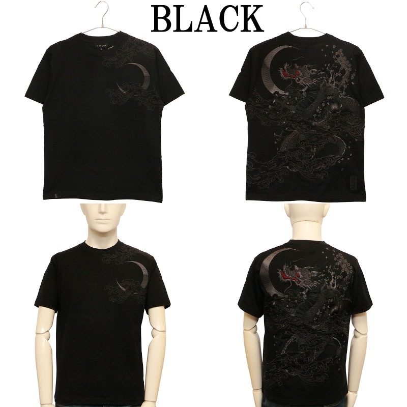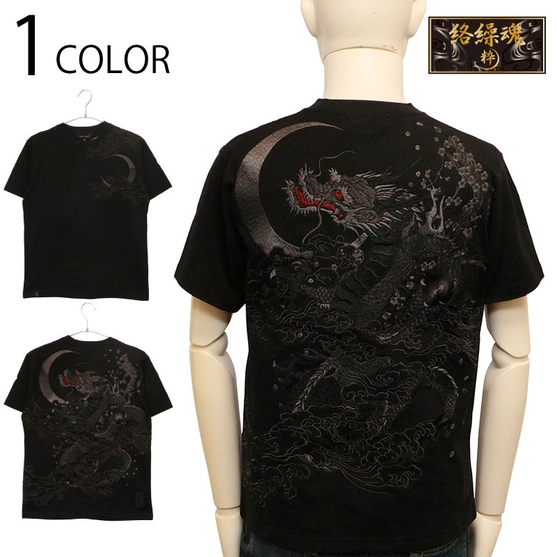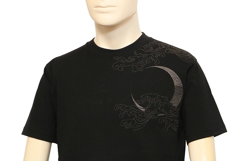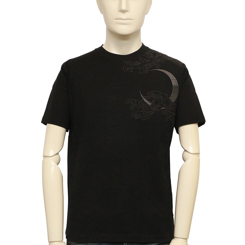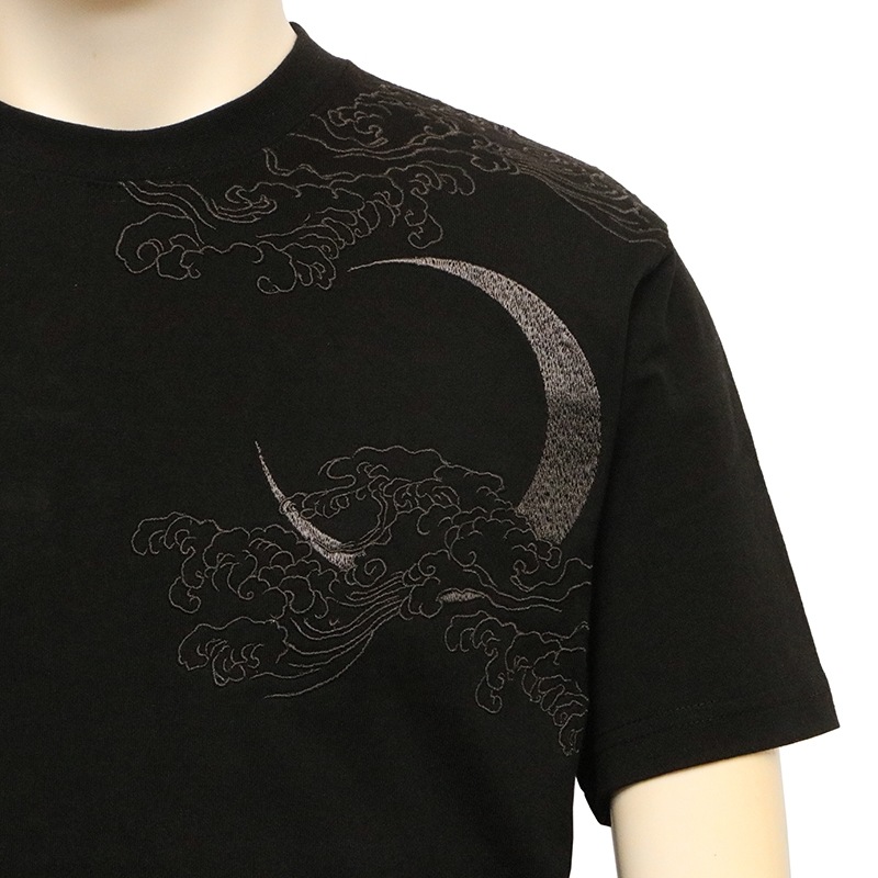 三日月を背景に天に登る龍を迫力ある構図で背面に刺繍で落とし込んだ半袖Tシャツ。