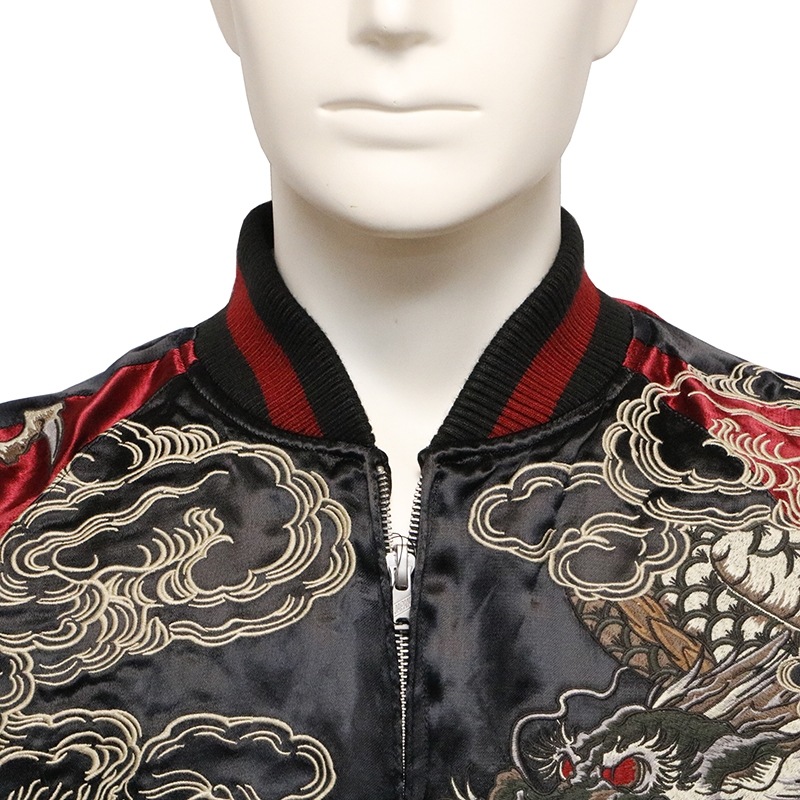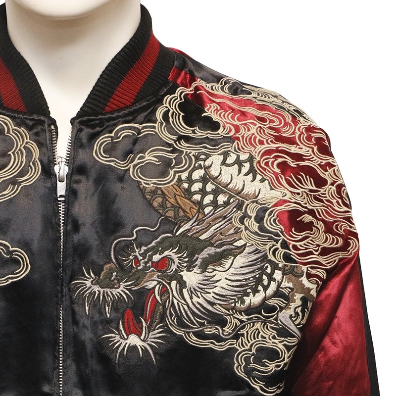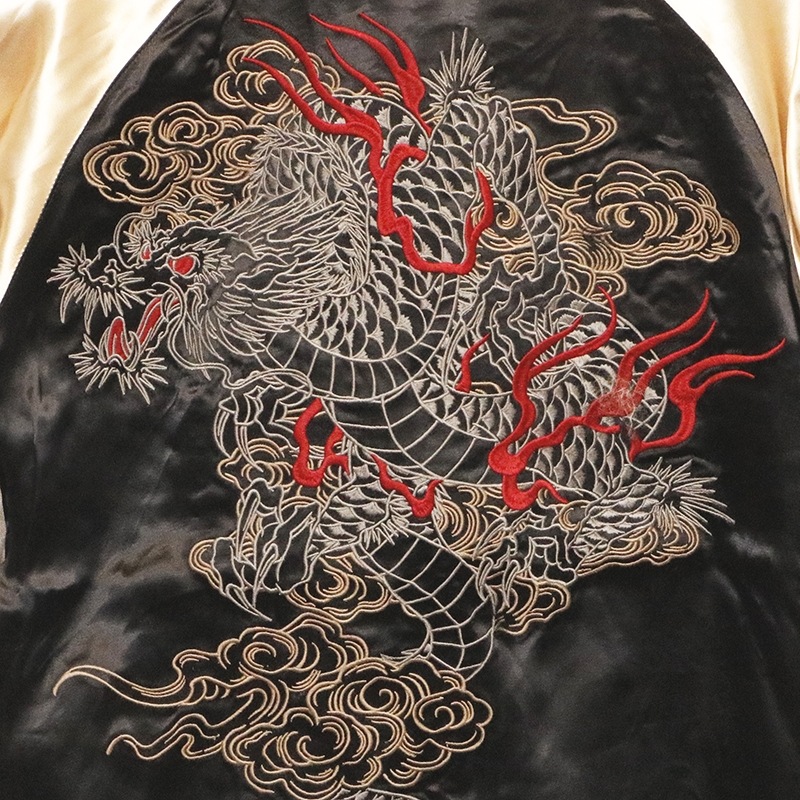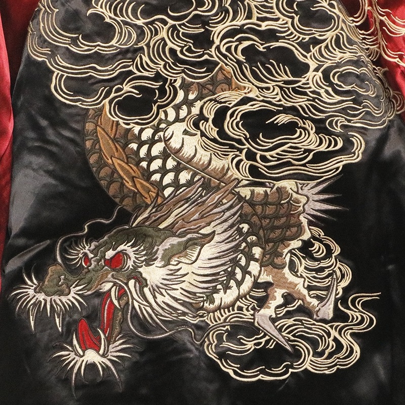 逆鱗に触れ暴れ回る龍の姿をリバーシブルに刺繍で落とし込んだスカジャン。