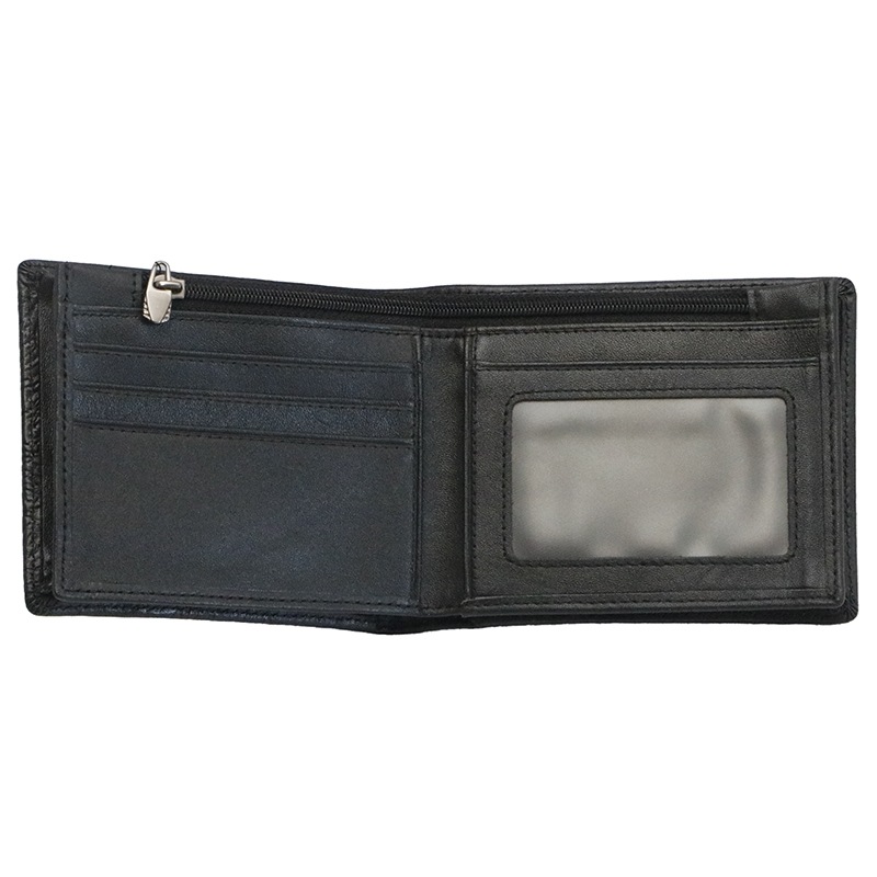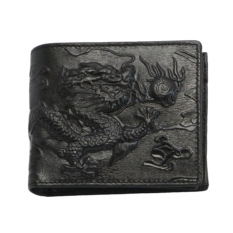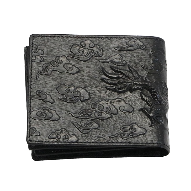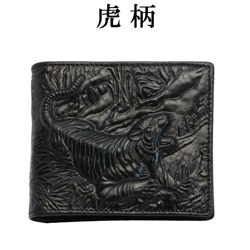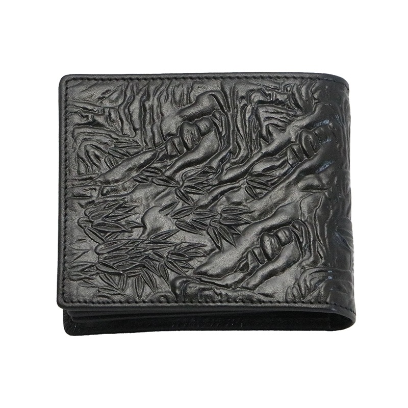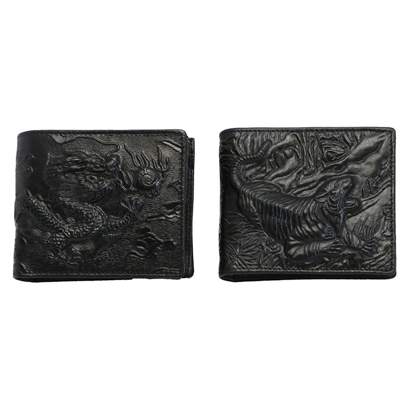 レザーを使った型押しの龍と虎を落とし込んだ2つ折り財布。