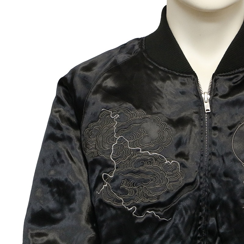表面の風神雷神の対比した迫力ある構図を刺繍で表現されており、リバーシブル面のBLACK×BLACKの生地に単色の刺繍糸を採用し、闇に潜むように表に風神、背面に雷神を刺繍。