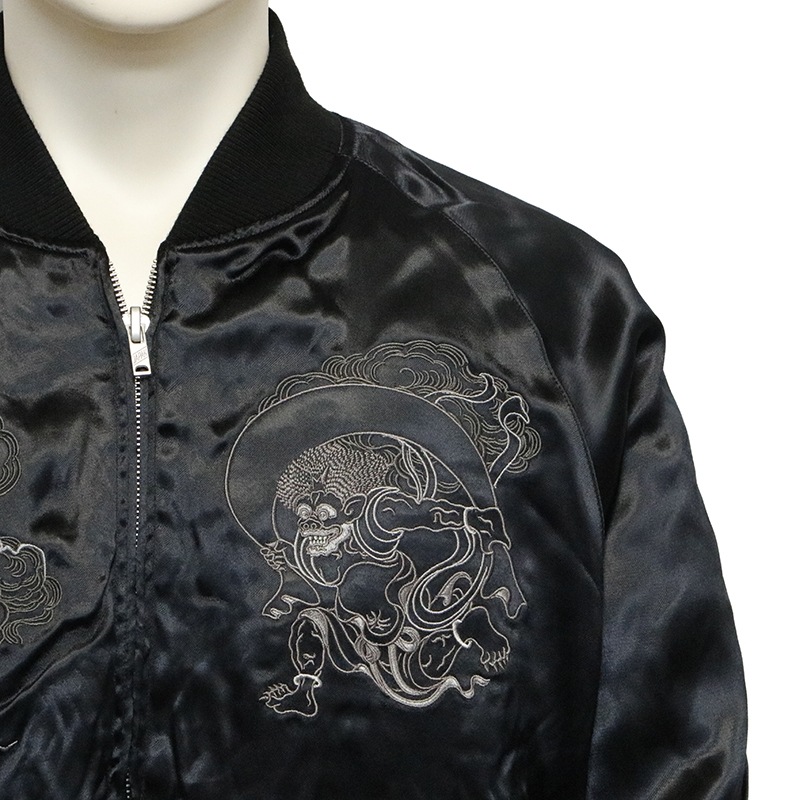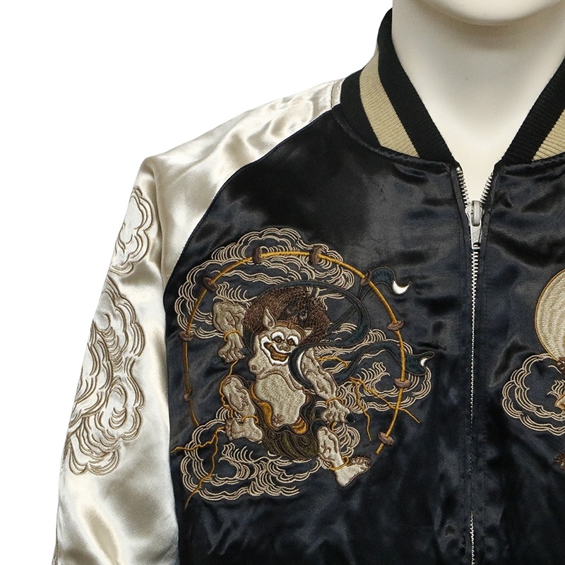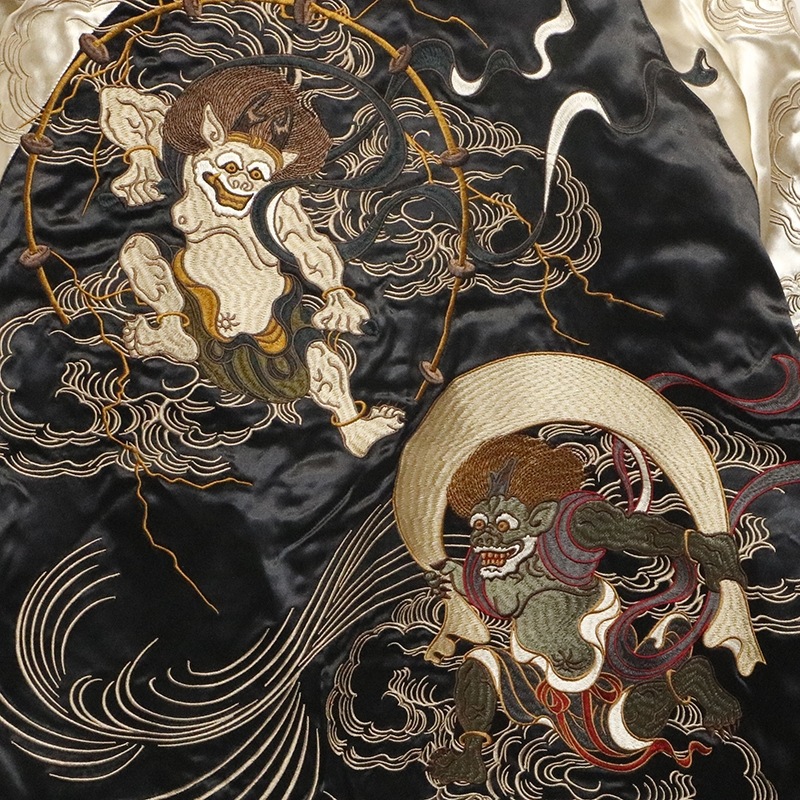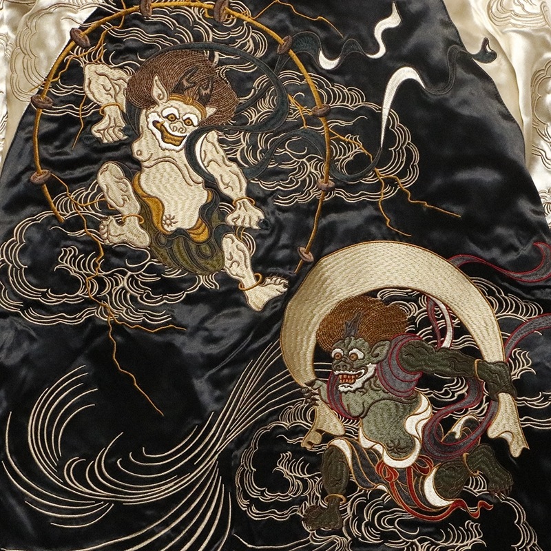 表面の風神雷神の対比した迫力ある構図を刺繍で表現されており、リバーシブル面のBLACK×BLACKの生地に単色の刺繍糸を採用し、闇に潜むように表に風神、背面に雷神を刺繍。