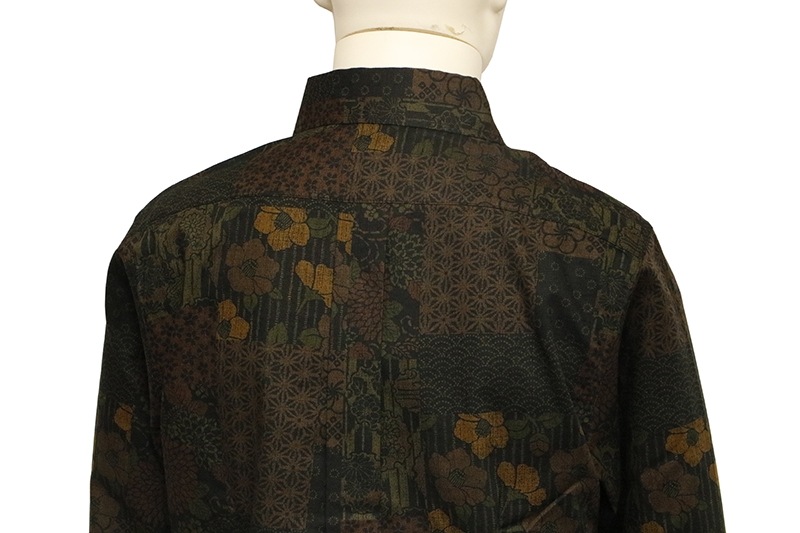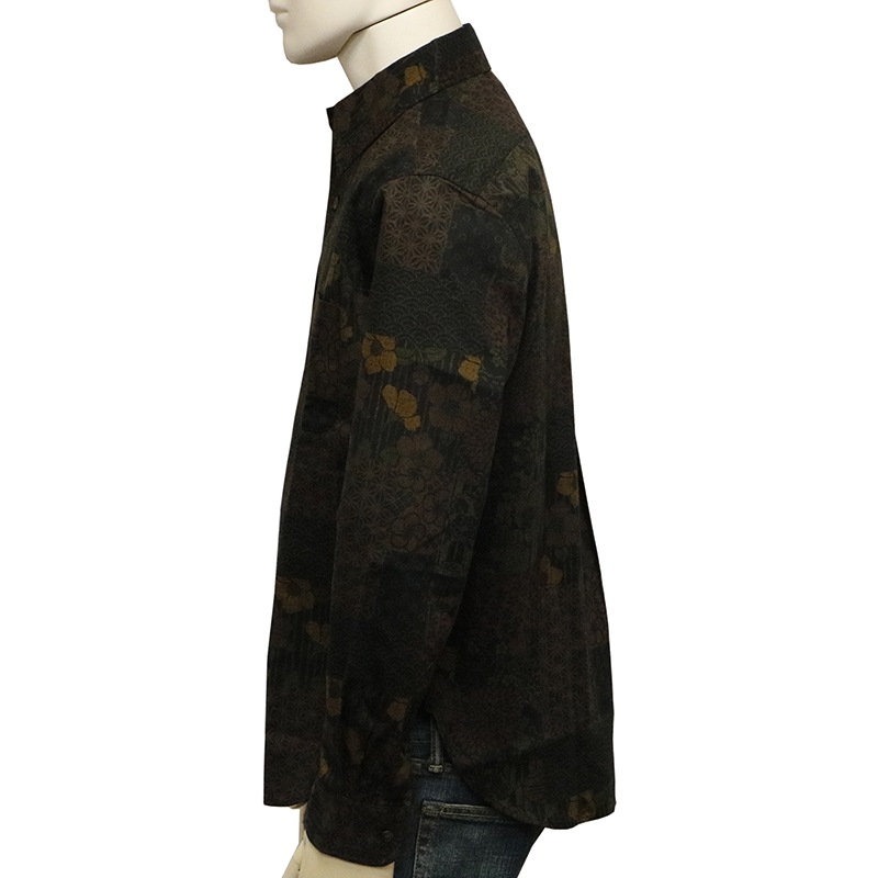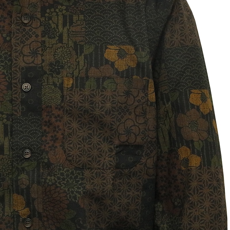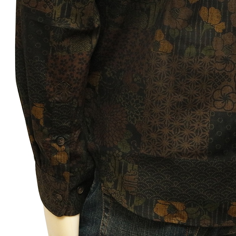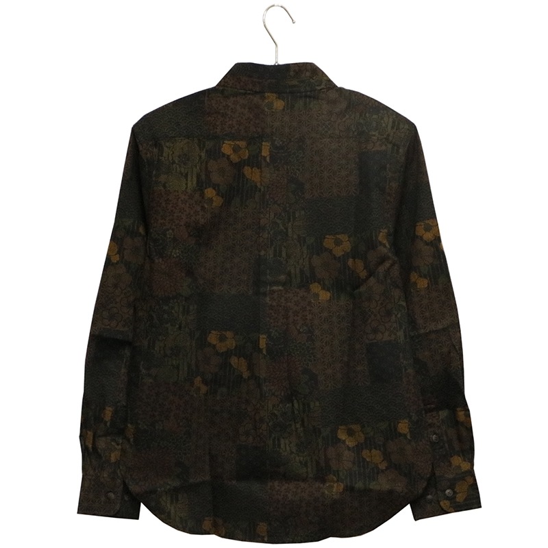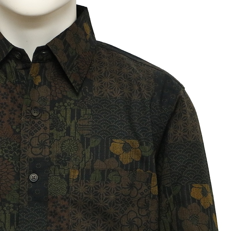 柄には古裂(こぎれ)パッチワークプリントを総柄であしらった長袖シャツ。