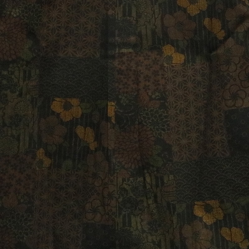 パッチワークプリントで様々な小紋柄や花々を総柄で落とし込まれてます。