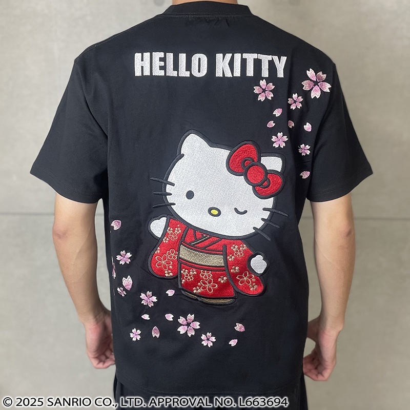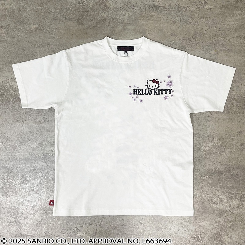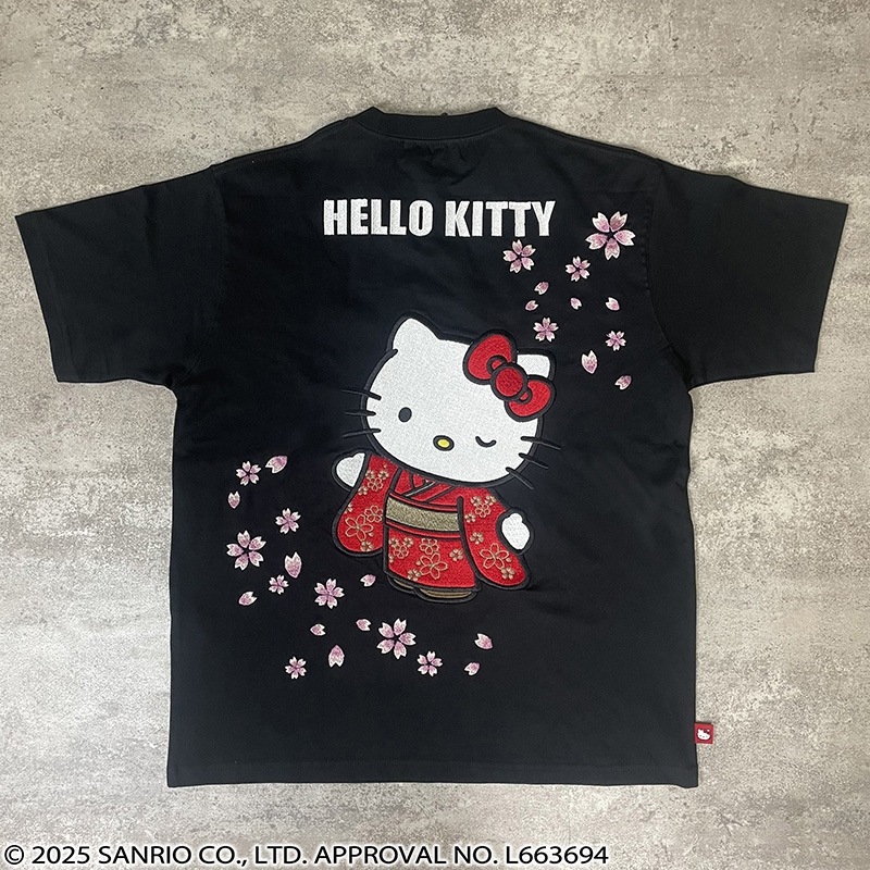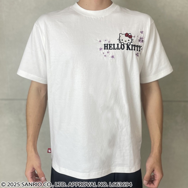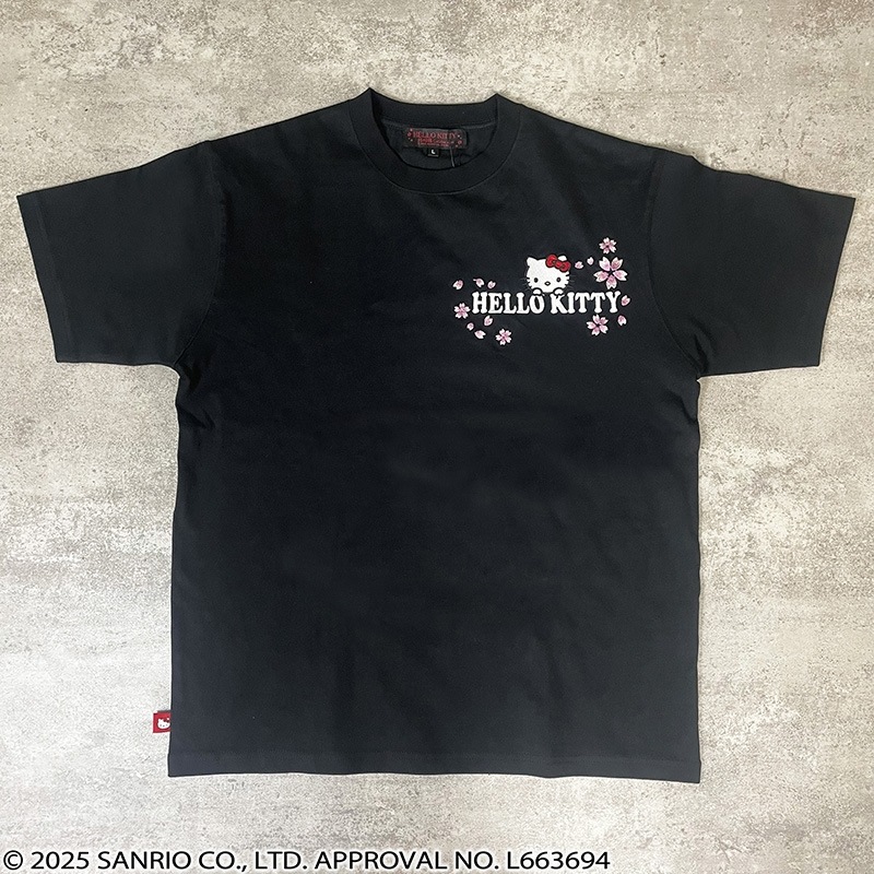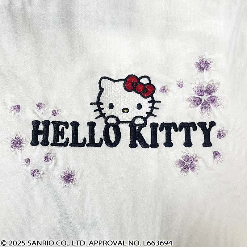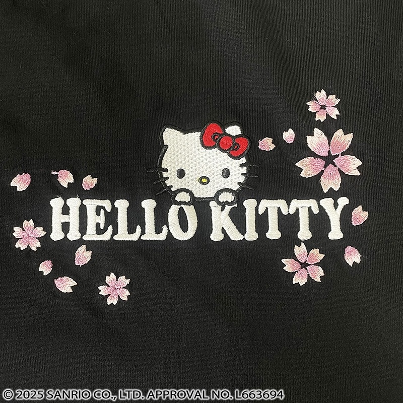 フロントには、左胸にハローキティと「HELLO KITTY」ロゴに桜を組み合わせ刺繡で配置。