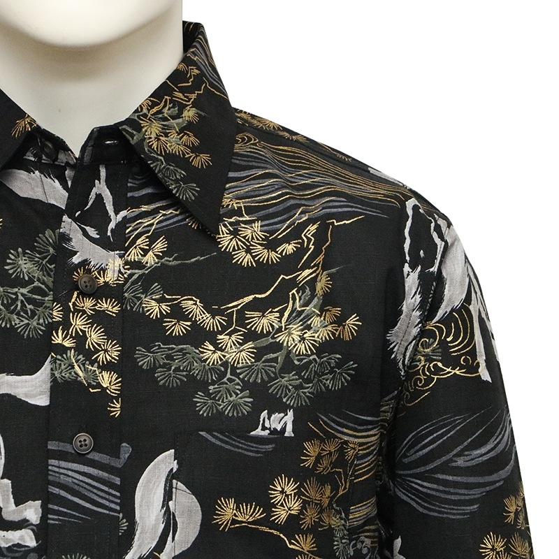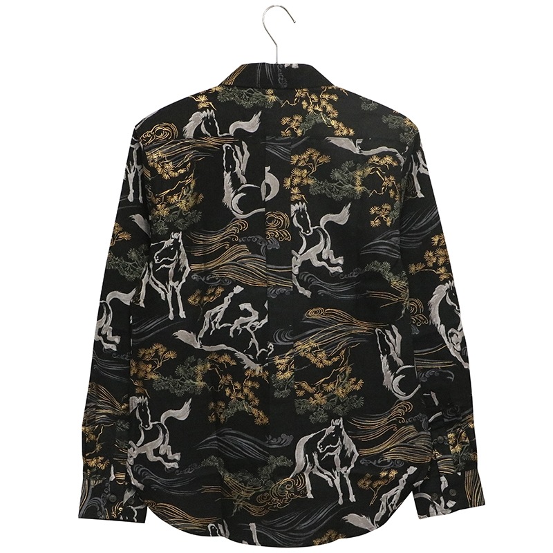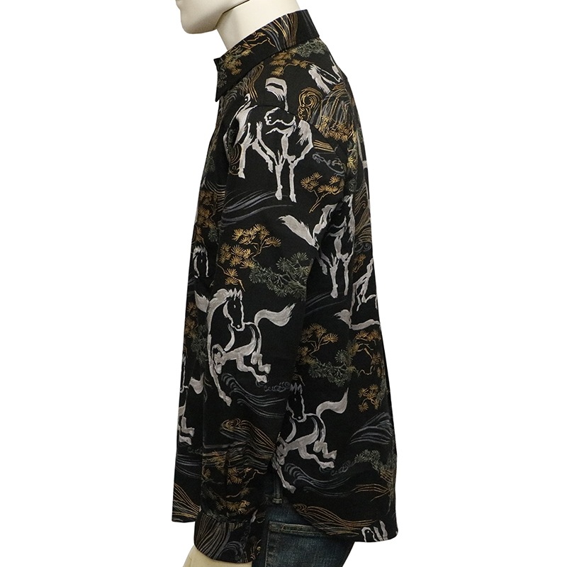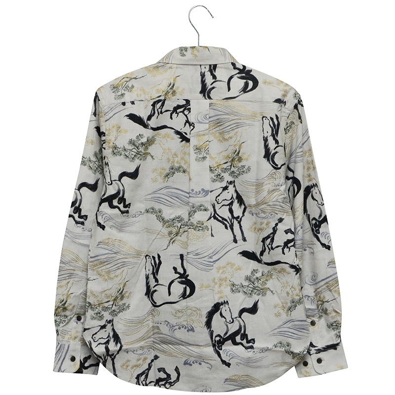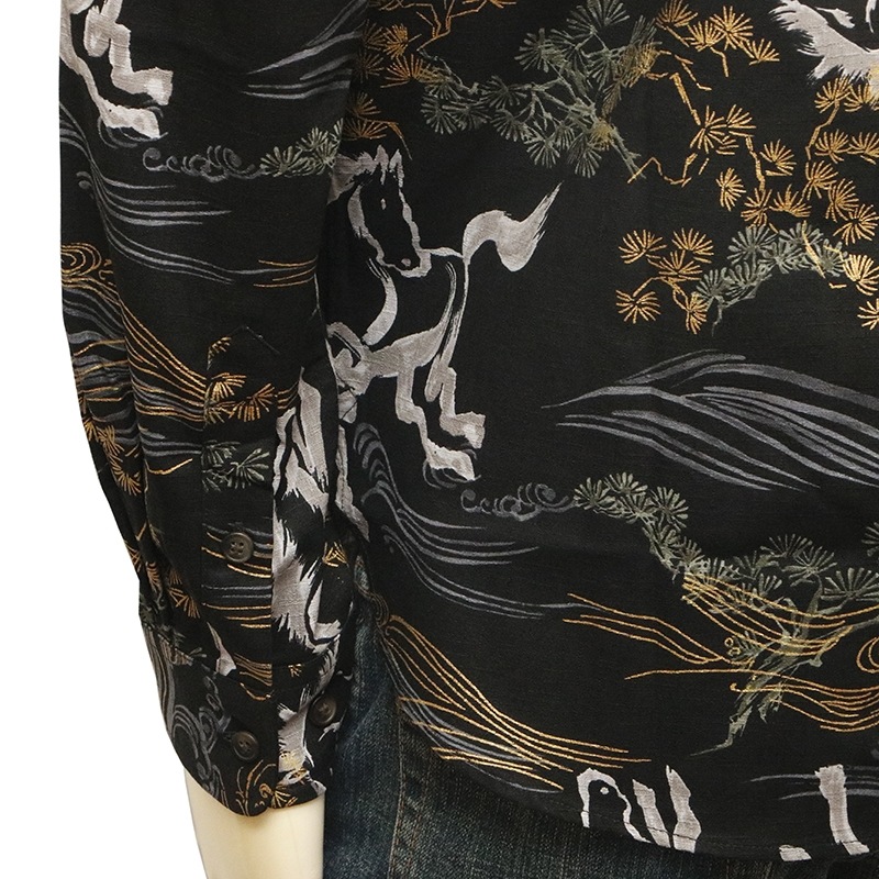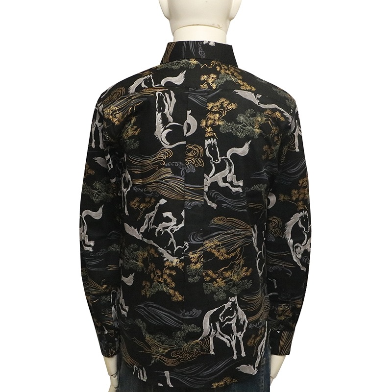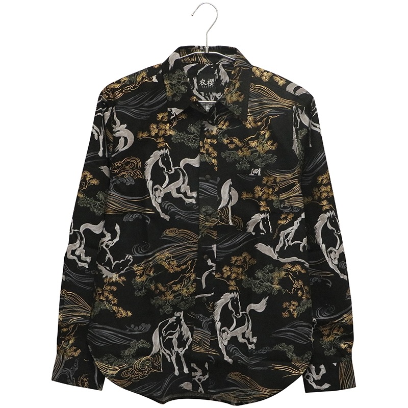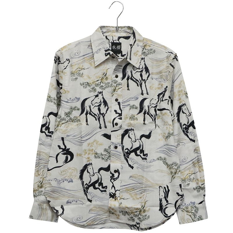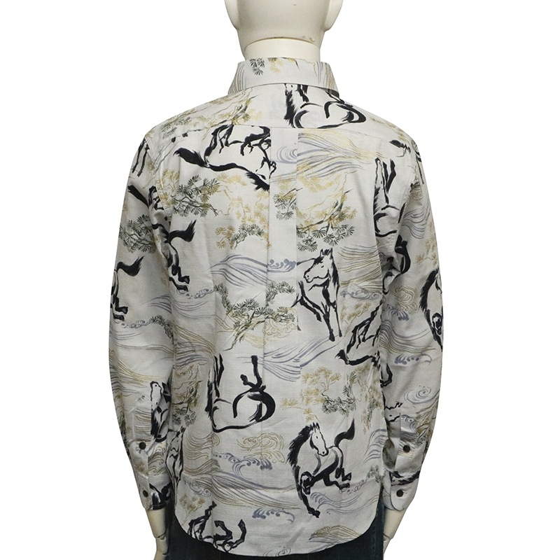 金彩墨絵馬を総柄であしらった長袖シャツ。