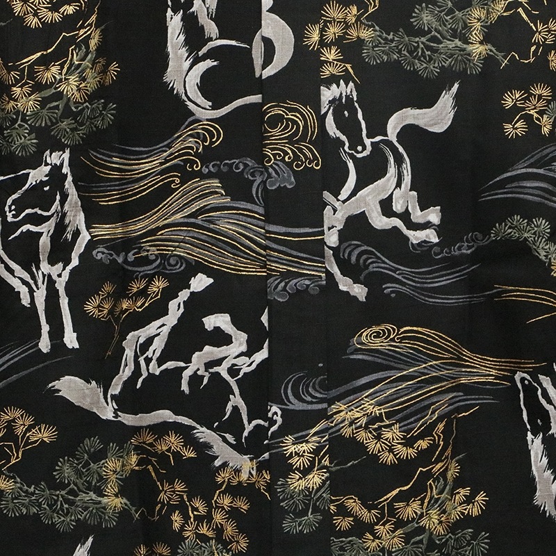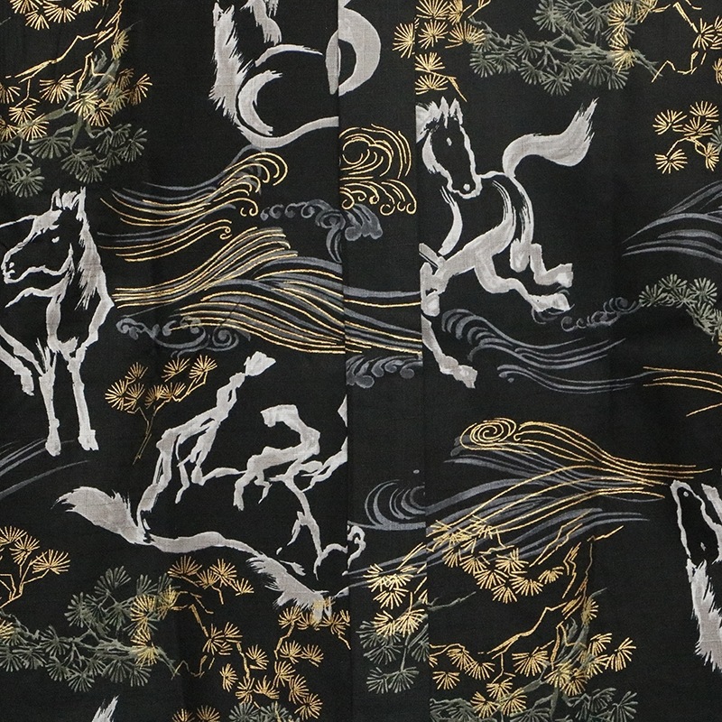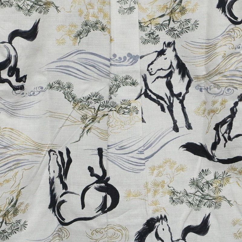 墨絵のようなタッチで馬を総柄で抜染で落とし込まれたデザイン。