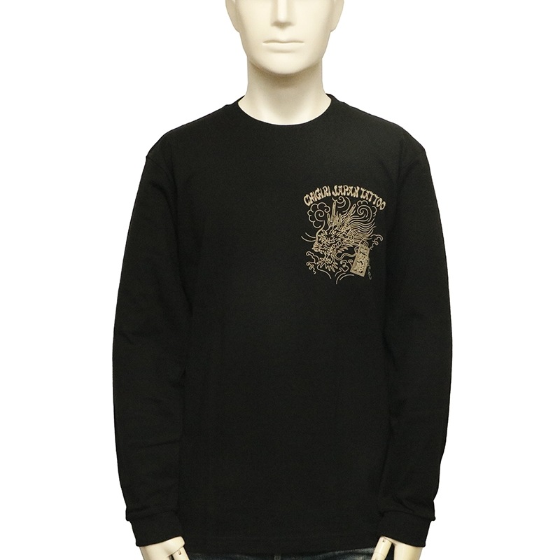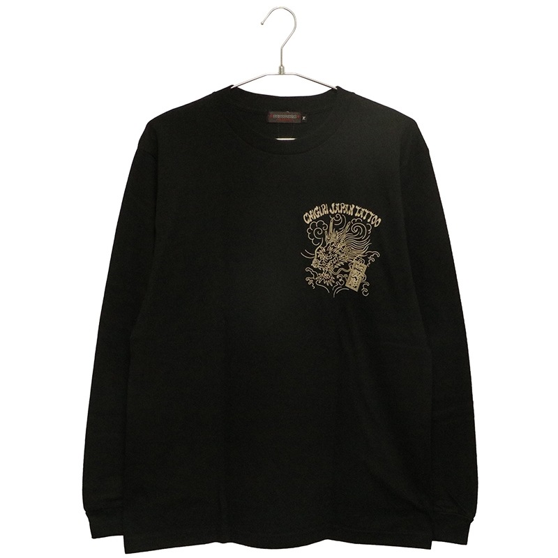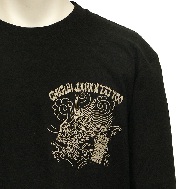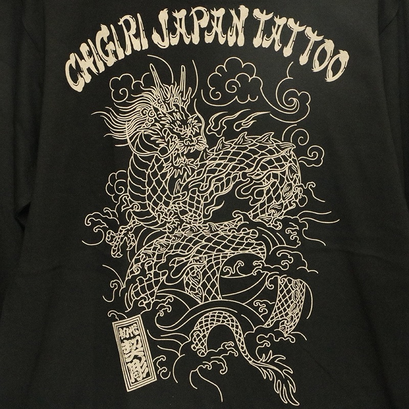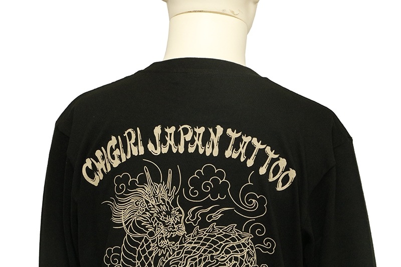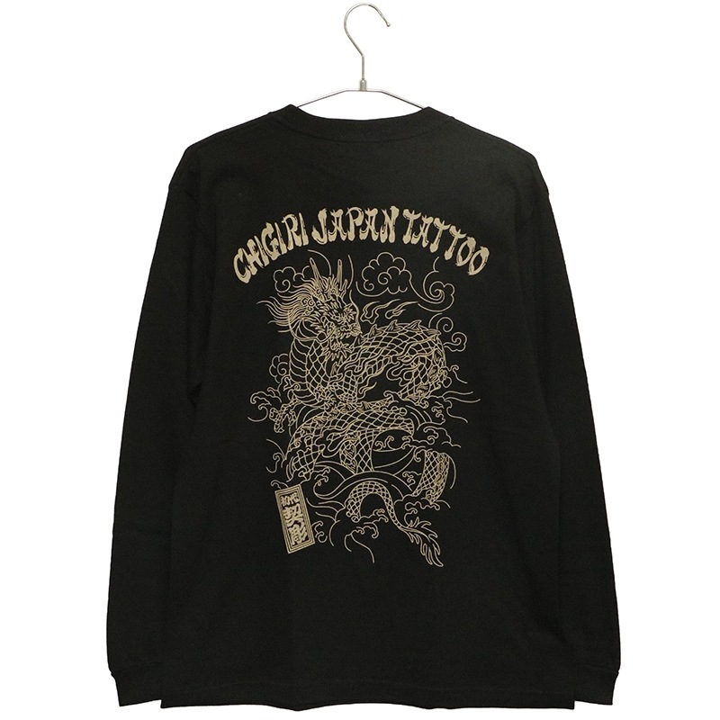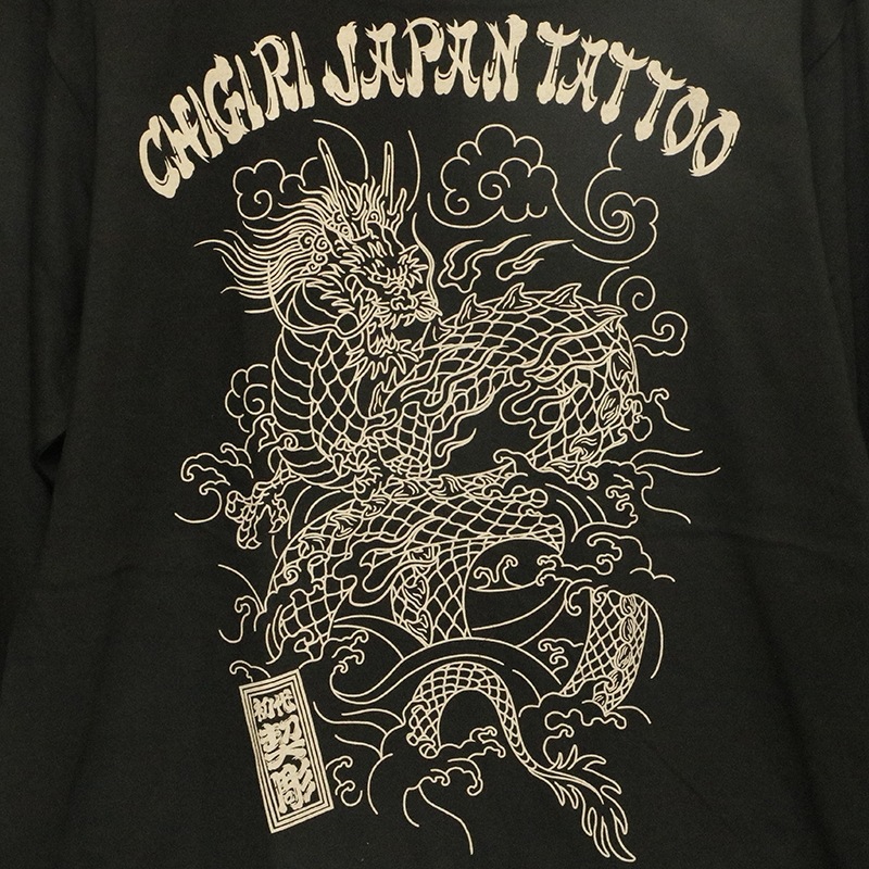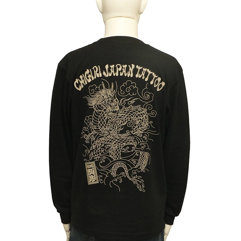 刺青の筋彫り調に描かれた龍を背面に落とし込んだ長袖Tシャツ。